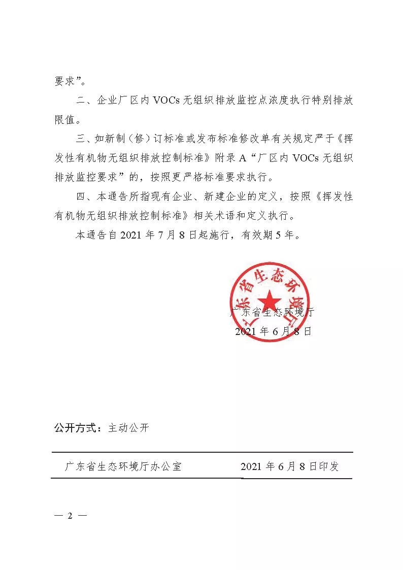 6月8日,广东省生态环境厅发布《关于实施厂区内挥发性有机物无组织排放监控要求的通告》,要求省内涉及VOCs无组织排放的新建企业自本通告施行之日起,现有企业自2021年10月8日起,全面执行《挥发性有机物无组织排放控制标准》附录A“厂区内VOCs无组织排放监控要求”。企业厂区内VOCs无组织排放监控点浓度执行特别排放限值。