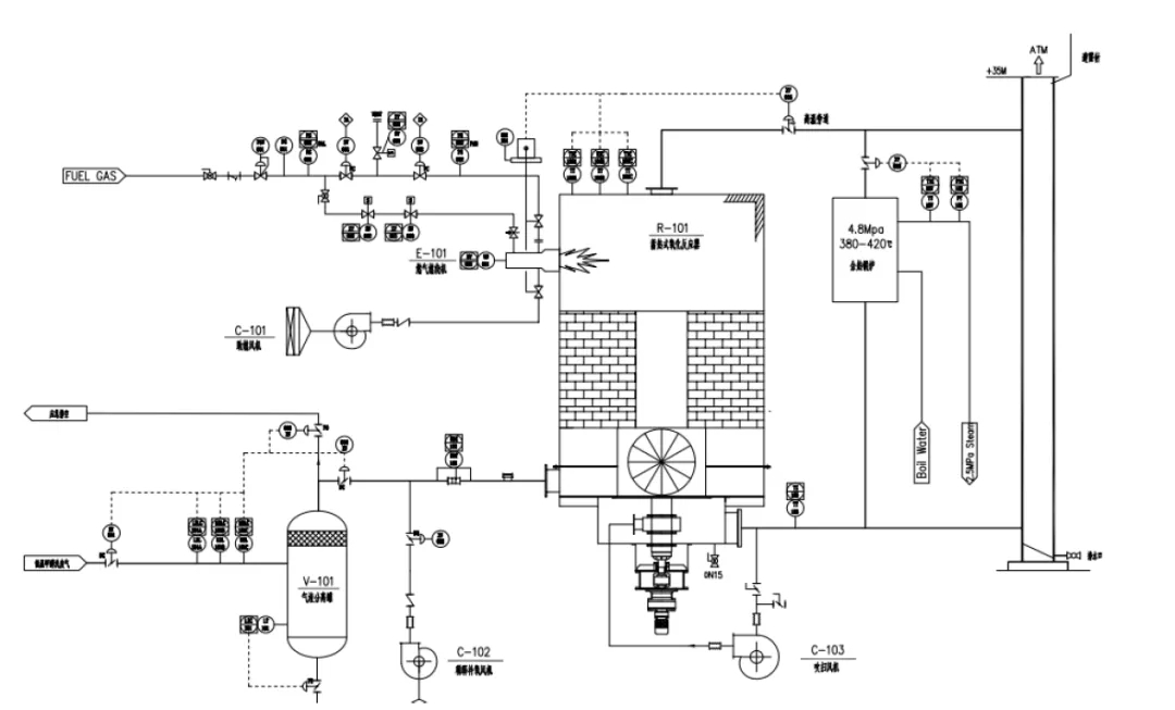 新疆广汇新能源有限公司煤制液化气采用Lurgi气化炉,低温甲醇洗废气量为56000Nm3/h,可燃组分浓度约4.6%,2019年新疆广汇新能源投运了一套5.6万方/小时处理量的TO直燃炉设备,配套50T/h余热锅炉,用来治理低温甲醇洗废气。项目总投资8000万,计划每年的余热利用效益1200万。因为TO直燃炉适合于浓度6%以上的废气,在低甲洗VOCs废气治理项目上使用能耗非常高,所以新疆广汇低温甲醇洗废气治理项目投运后,每小时需要伴烧100—200Nm3/h天然气,经济效益比预算大打折扣。